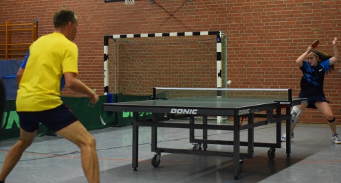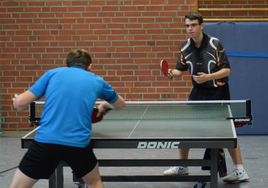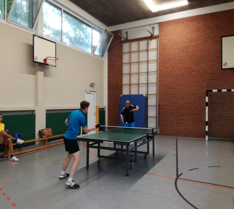 Im Spiel um den dritten Platz trafen Uwe und David aufeinander. Alles sah zunächst nach einem klaren Erfolg für Uwe aus, doch David kämpfte sich auf 2:2 heran, konnte aber im entscheidenden fünften Satz der ganzen Routine des Oldies Uwe nichts mehr entgegensetzen. Das Finale lautete: Tim (“Niederländischer Youngster“) gegen Marco (“Ewiger Zweiter“). In einem starken Match, mit teilweise hochklassigen Ballwechseln, behielt Tim am Ende die Oberhand und gewann 3:1, auch weil mit zunehmender Spieldauer das Händchen von Marco immer schwerer wurde.