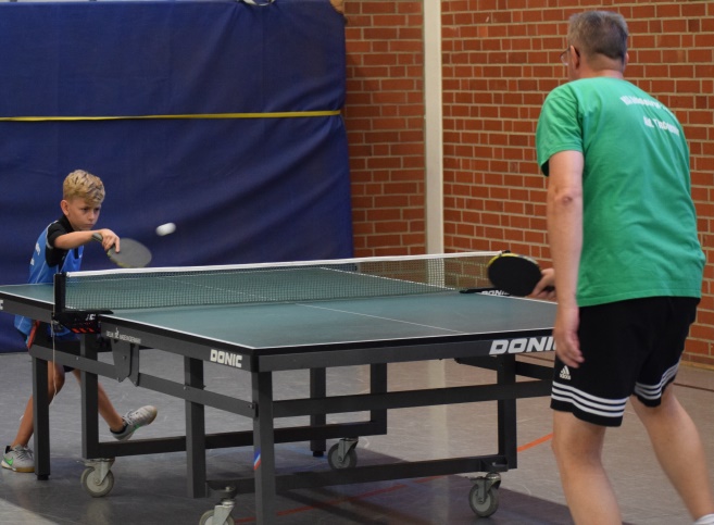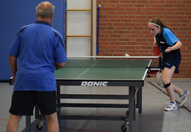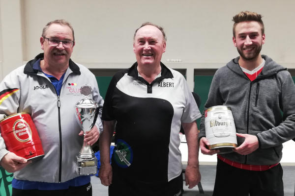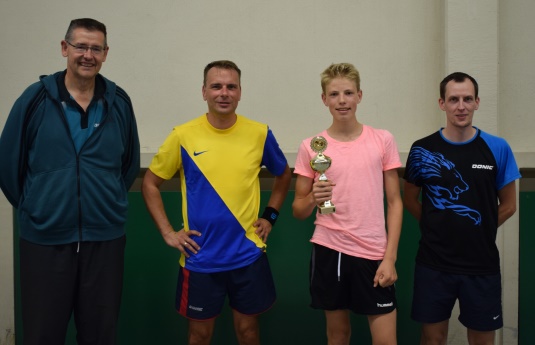 Im Finale Lukas gegen Reiner gewann Reiner mit 3:1 Sätzen, Lukas war schon etwas erschöpft von den vorherigen Spielen im Viertel- und Halbfinale. So gewann wohlverdient und voller Freude unser langjähriger Abteilungsleiter den Pokal.